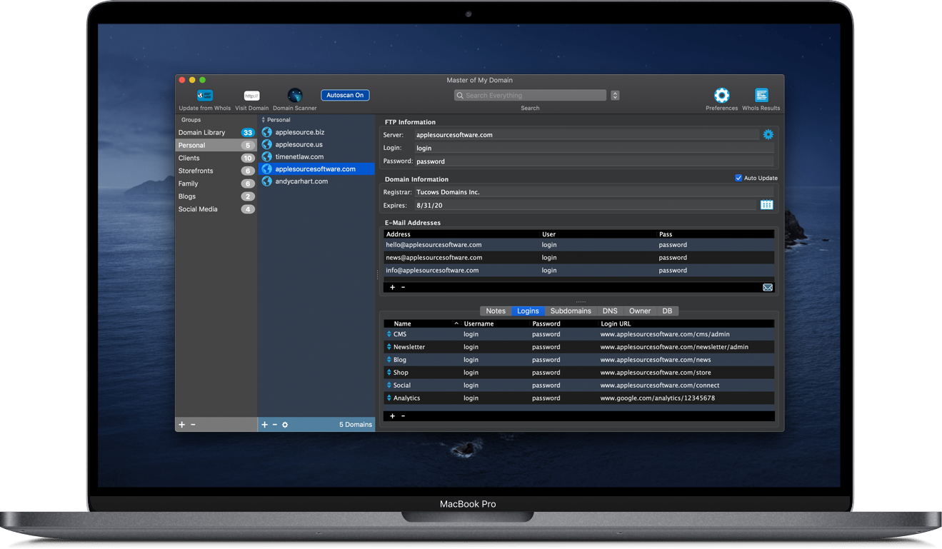 Master of My Domain keeps track of registrar and expiration info, mail server settings and credentials, all your website logins, subdomains, DNS entries, database logins, domain owner contact info, free-form notes, and more.