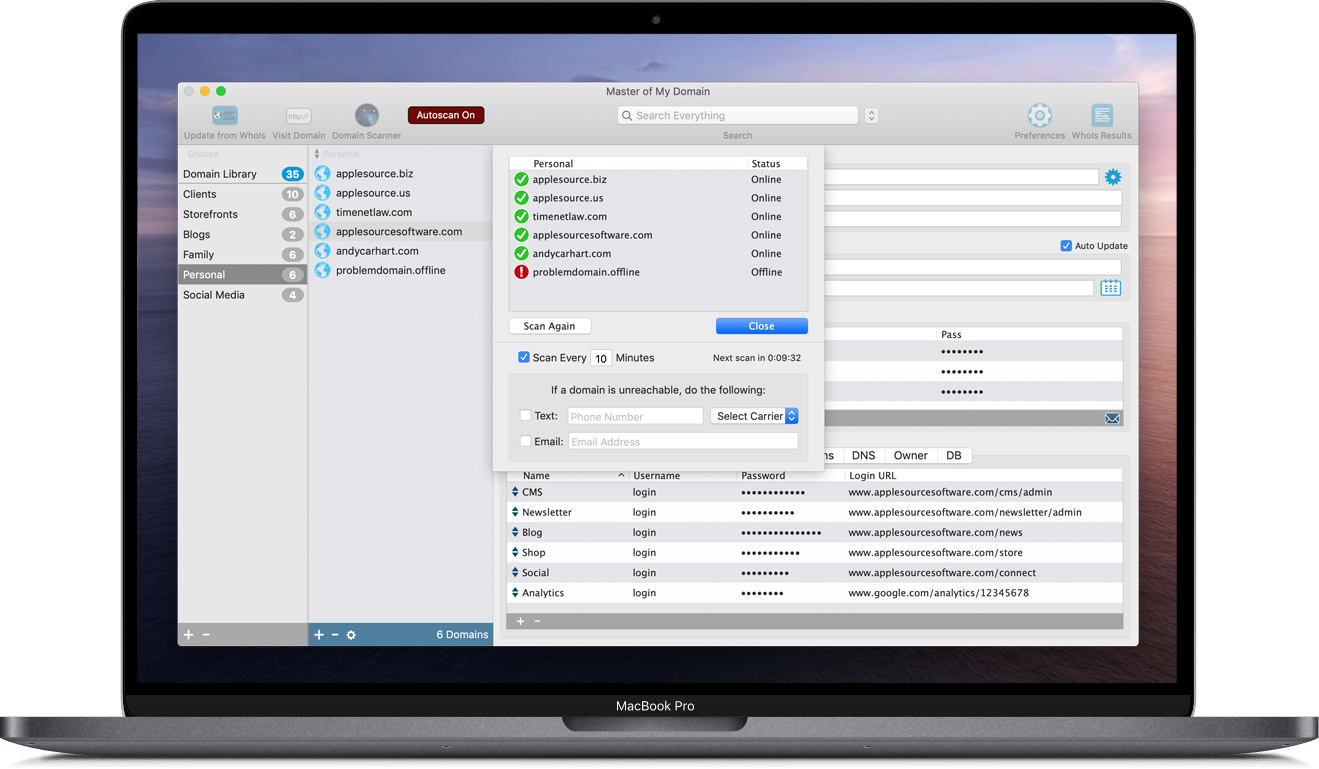 The Autoscanner can ping all of your servers regularly and let you know if a website is down via system notification, email, or text. If something goes down, you'll know before anyone else.